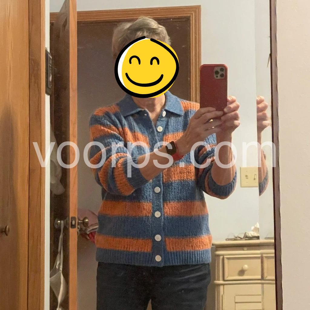 This cardigan is such a comfortable fit for everyday outings during the changing seasons. The blue and orange horizontal stripes look nice in person, and the collar frames my face really well. I can button it up without feeling tight or bulky, which is exactly what I wanted for daily wear.
