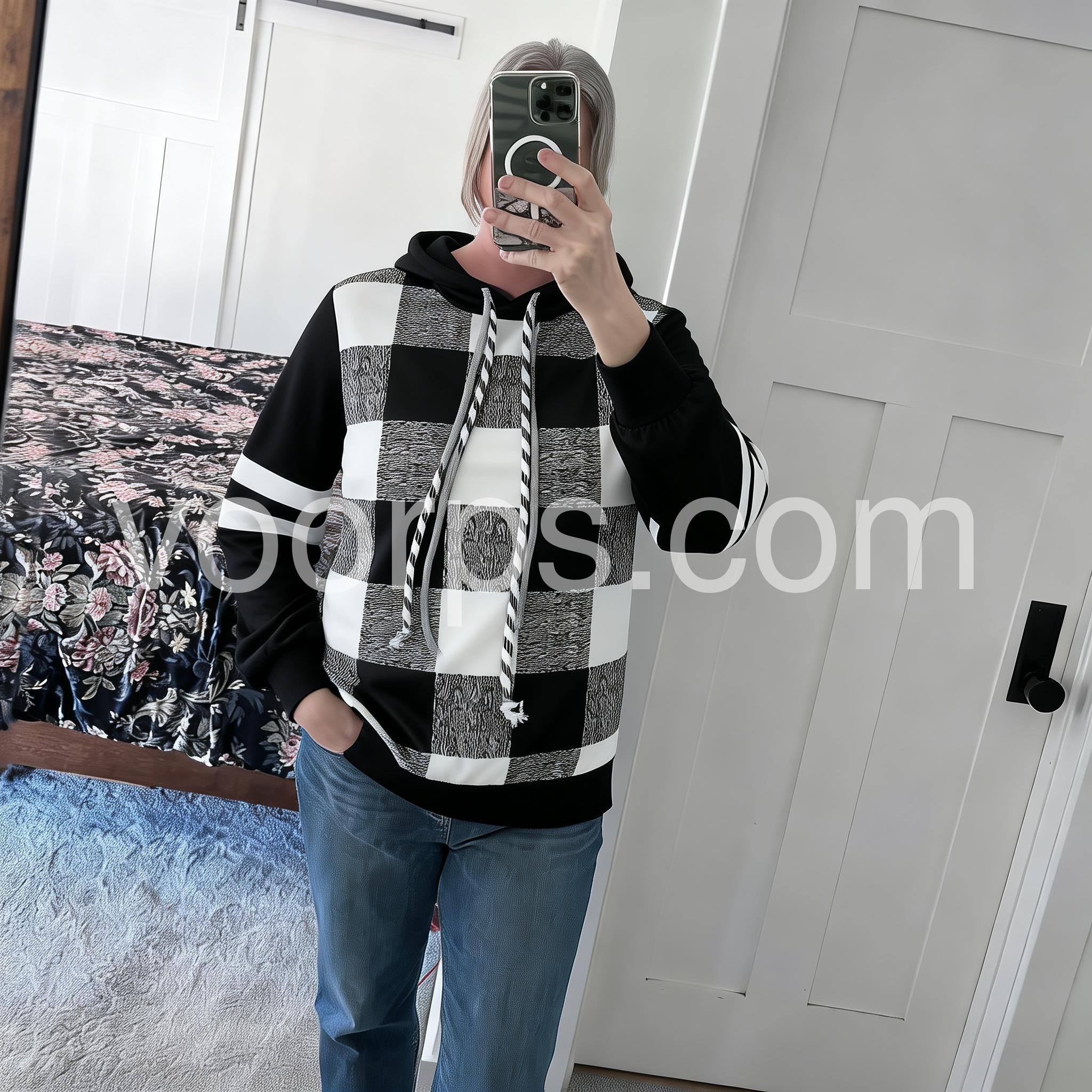 Keep it retro-classic with this black and white checkered hoodie! Repeating white and black blocks makes this comfortable hoodie a must-have for your casual days, along with two stripes on the black long-sleeves for a retro look. The drawstrings are made to match, giving this fashionable hoodie a non-stop black and white design.