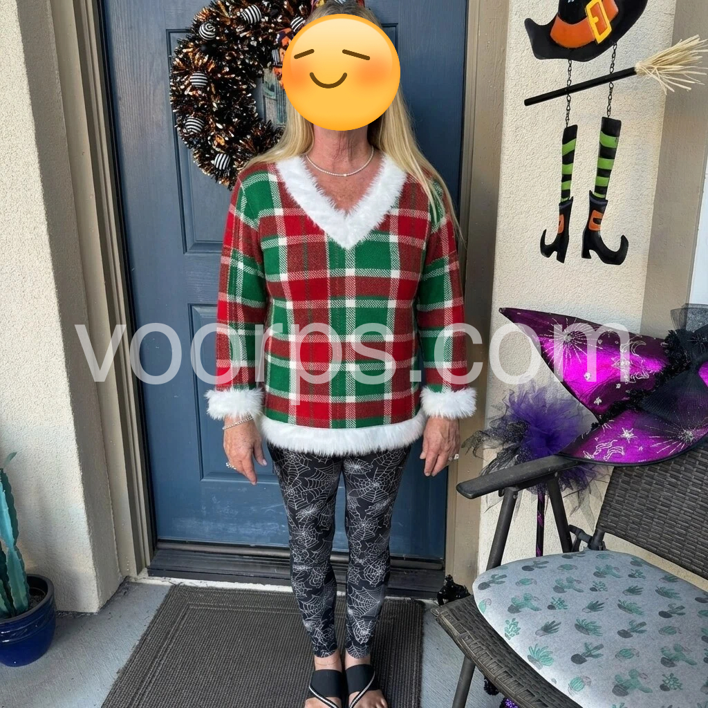 Absolutely adore this festive top! The red and green plaid is so cheerful, and the white fur trim adds a luxurious, cozy feel. The V-neckline is flattering and the long sleeves keep me warm. It’s lightweight enough to layer under a jacket, but cute enough to wear on its own. I’ll be wearing this all holiday season long!