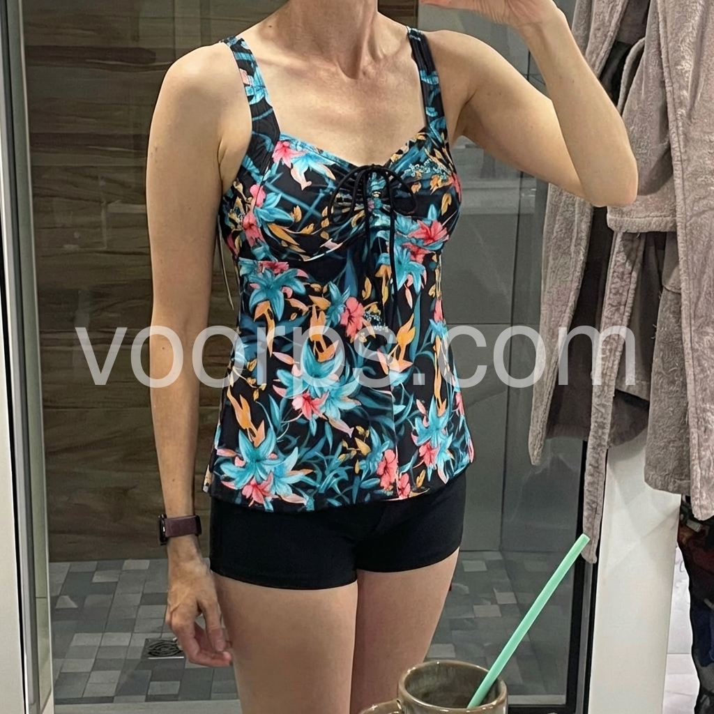 This tankini set is perfect for my beach vacation! The vibrant tropical print is so eye-catching, and the ruffled hem is super flattering. The ruched front with a drawstring lets me adjust the fit, and the black shorts provide great coverage and comfort. The fabric is quick-drying and stretchy, making it ideal for swimming and lounging. I felt confident and stylish all day long!