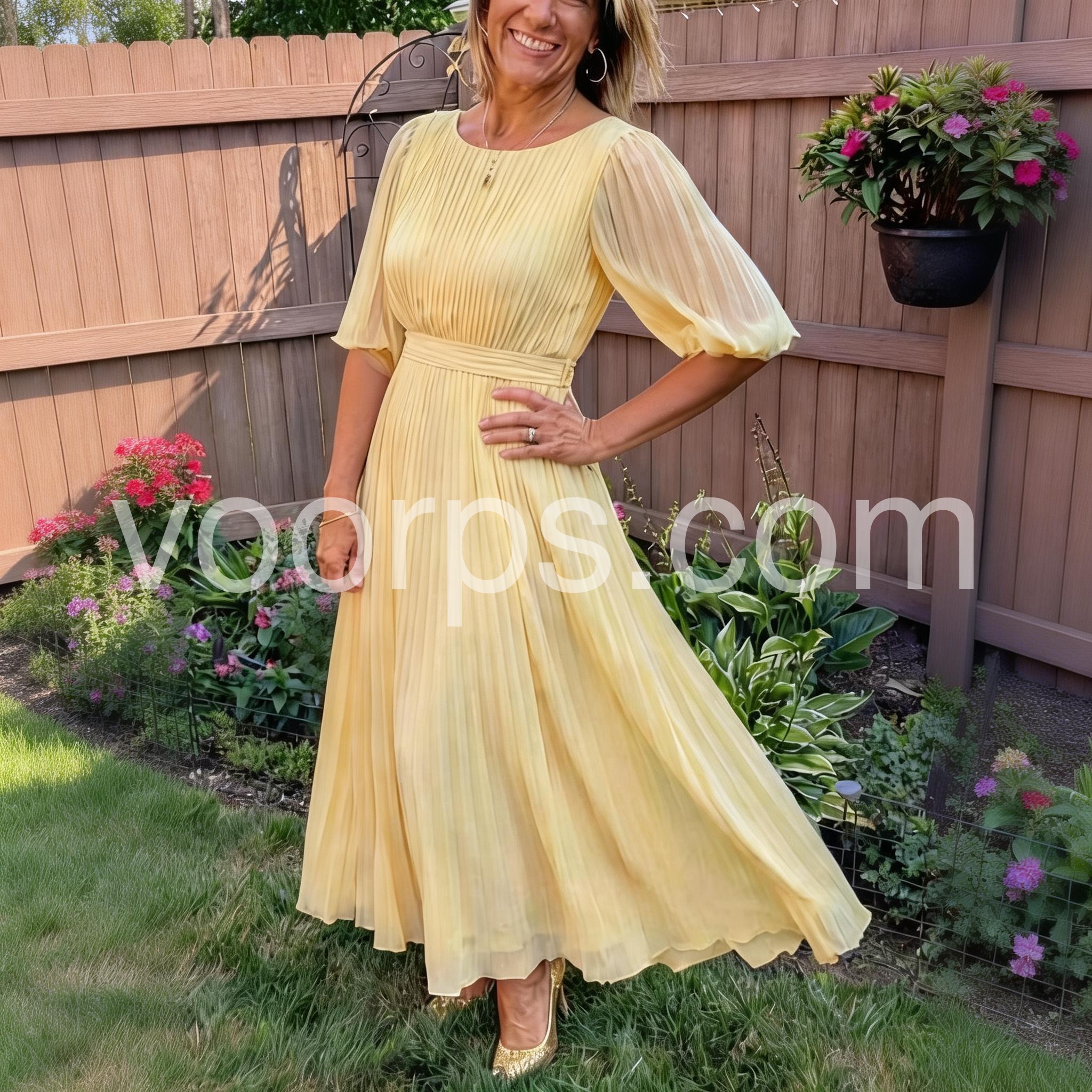 Lovely dress. Material nice. My husband really liked it on me. I also received so many compliments on it! The fit is comfortable and stylish! The yellow color is bright and it is really so beautiful for spring or summer.