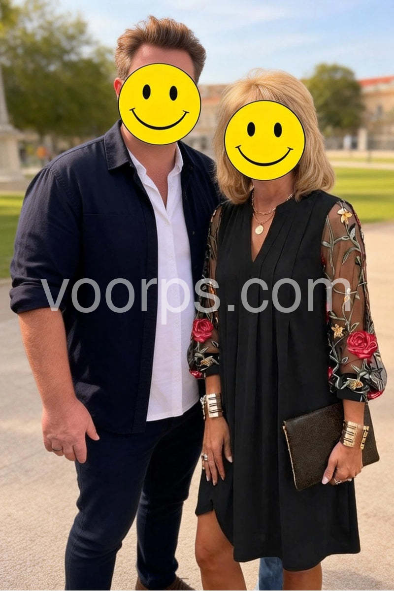 The detail on the sleeves is simply gorgeous. The stitching for the roses looks very high quality and not cheap at all. The dress itself is flowy and very forgiving. It makes me feel dressed up without sacrificing comfort. A great staple piece for any wardrobe.