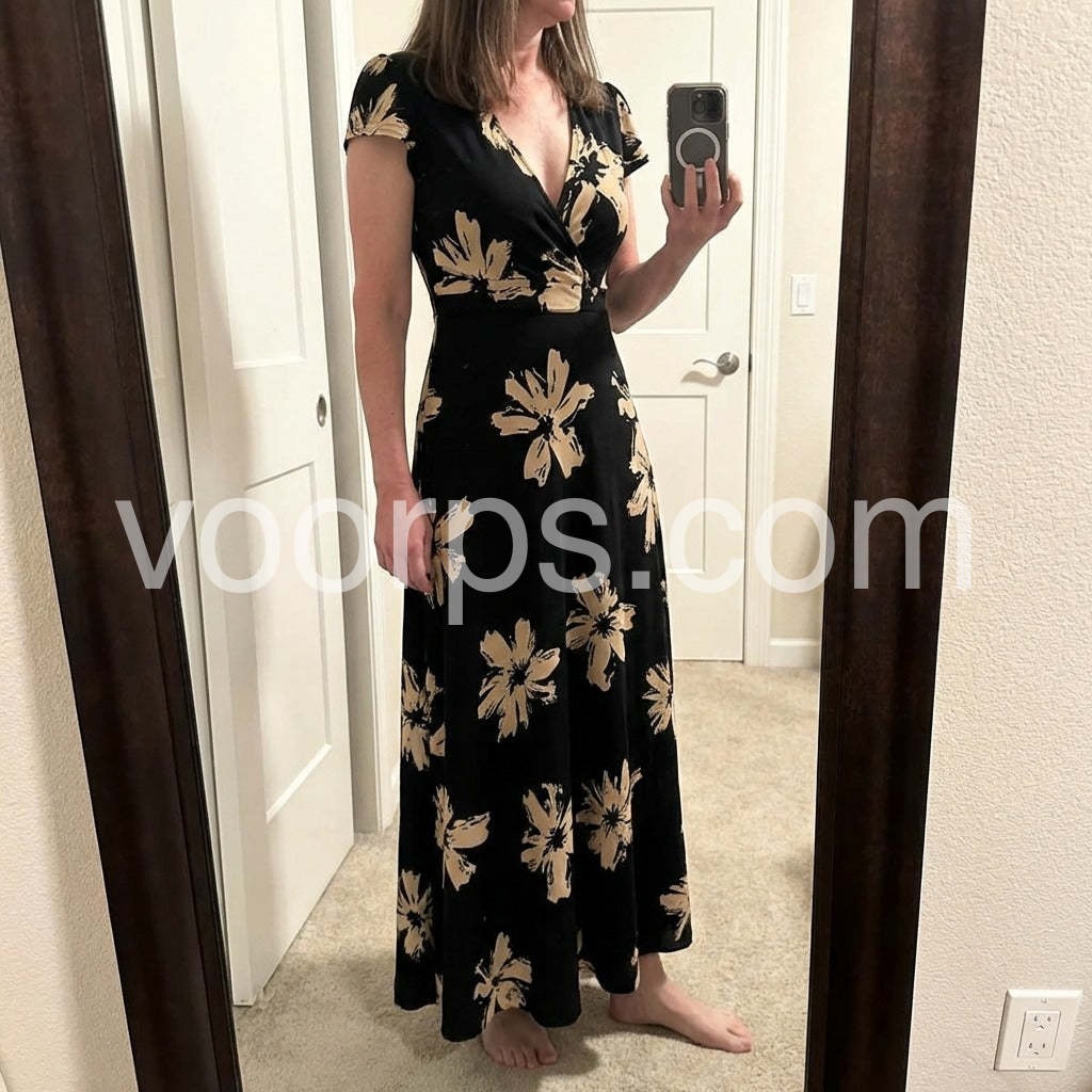 Gorgeous maxi dress! The material is very soft and drapes wonderfully. I love how the skirt flows when the wind catches it. The contrast between the black and the light tan flowers is gorgeous. I have worn it twice and gotten stopped both times by people asking where I bought it.
