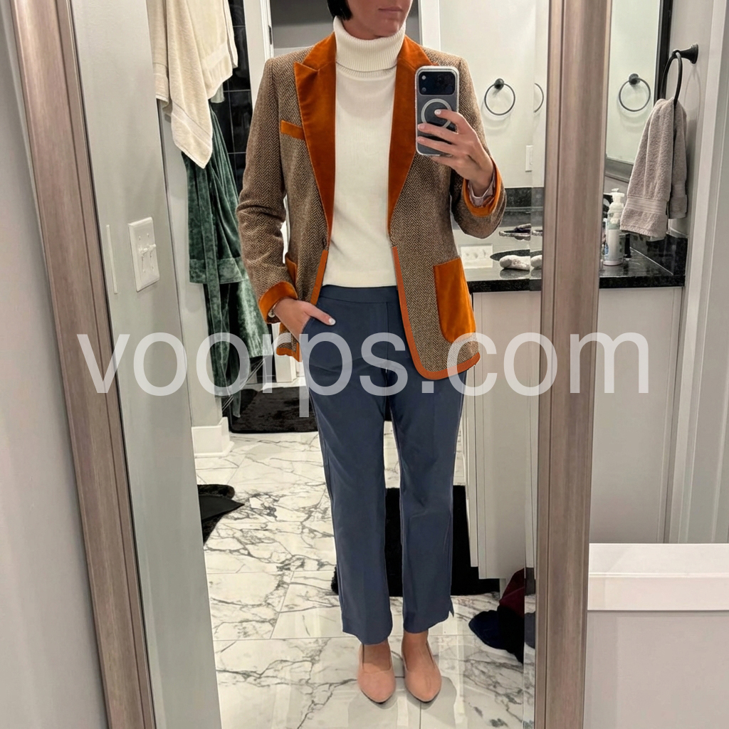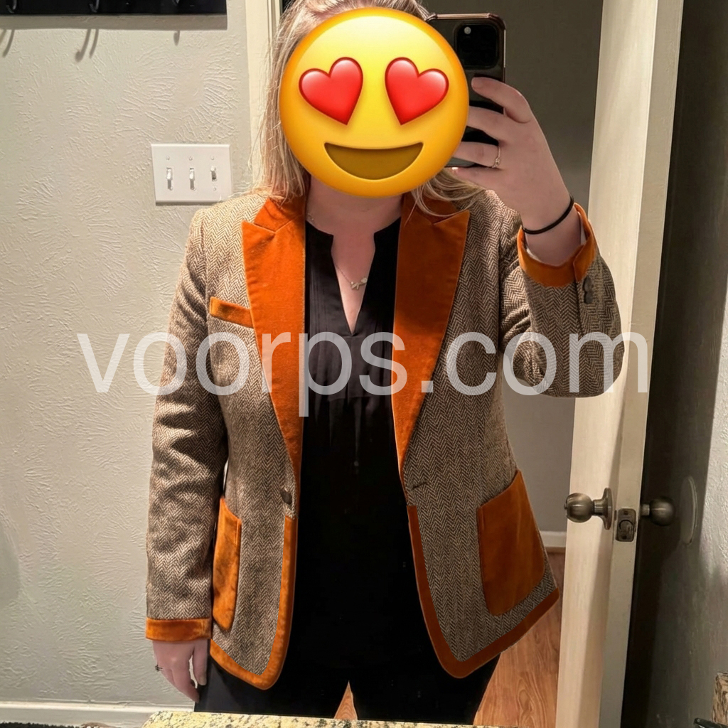 I absolutely love this blazer style coat! The warm herringbone texture looks super premium, and the caramel suede-like trim gives it a classy, high-end vibe. It fits nicely through the shoulders and lays really well without feeling bulky. I’ve worn it for both casual and slightly formal occasions, and it always looks put-together.