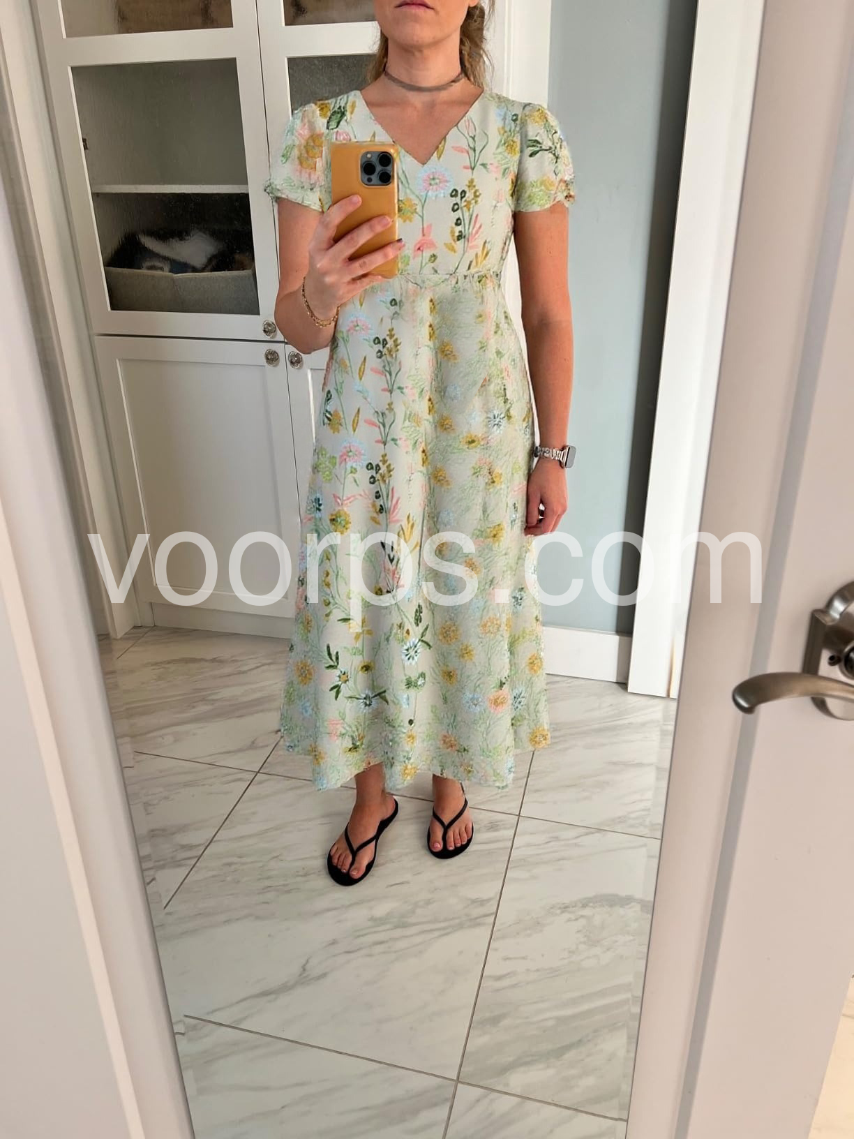 I am in love with the flutter sleeves and the subtle V-neck. It gives the dress such a romantic and feminine touch. The length is perfect for me with a pair of strappy heels.